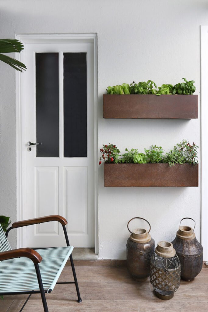 Para quem gosta de cozinhar, ter temperos por perto faz parte da rotina. Pensando nisso, a designer de interiores Carolina Esper montou uma jardineira de aço corten na parede do quintal da casa de vila onde vive, na cidade de São Paulo. O ponto escolhido, onde bate mais sol, garante os ingredientes sempre frescos a dez passos de distância da cozinha.