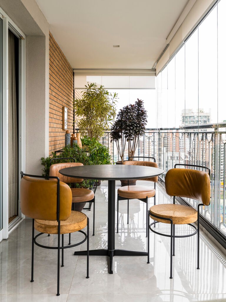 Para criar um espaço de relax para o cliente que se mudou de Salvador para São Paulo, as profissionais do Estúdio Amadas apostaram na varanda. Mesa e cadeiras mais baixas fazem companhia ao aparador com rodízios que se converte em bar nos dias de festa.